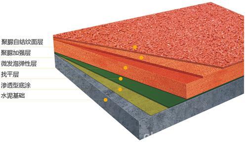 全塑型塑膠跑道分兩層結構,底層以再生膠粒與單組份膠水按比例混合攪拌后經(jīng)由專(zhuān)業(yè)施工隊鋪設壓平,面層由EPDM橡膠顆粒與單組份膠水混合而成,厚度為13mm。